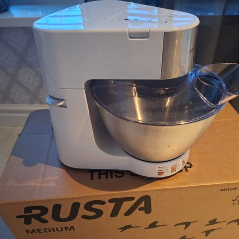 On köksmaskin med effekt på 1000 W i svart färg. Maskinen är utrustad med rostfri bunke och flera vispar för olika ändamål. Passar för blandning, vispning och knådning i köket.