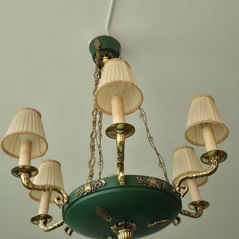 Mycket vacker Majolika lampa. Finns även prismor i kristall som hänges under varje stearinljus. Elbelysning och/eller stearinljus. Lampskärmen i glas är för ömtålig för att skickas. Kräver takhöjd.