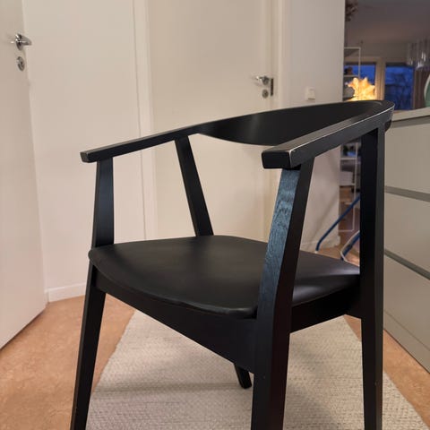 En av stolarna (se bild) har ett litet märke på ena armen, går att detta på svart märkfärg för att ta bort. Utöver det är stolarna i nyskick och köptes precis innan tillverkningen upphörde.