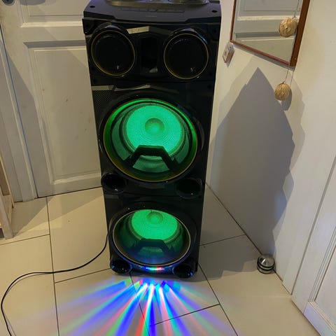 Dmtech högtalare med 2 mic ingångar och LED-belysning i flera färger. En fristående ljudenhet med stora högtalarelement och kontrollpanel med rattar och knappar för ljudjustering. Lämplig för användning i hemmiljö eller vid fester.