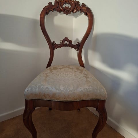 Stadig stol i bra skick men med aningen slitage i tyget och pyttesmå fläckar, se bild. Undersidan buktar ut lite.