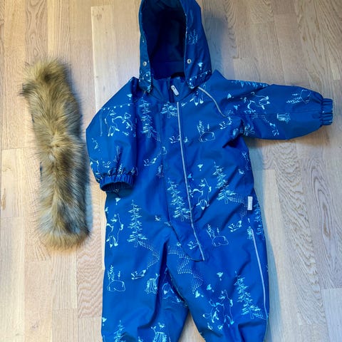Fin varmfodrad, vattentät och vindtät overall från Reima, modell Stavanger. Luvan är kantad med en mjuk pälskant och fästs med tryckknappar. Varsamt använd och i fint skick men har några små slitningar, se bilder, därav det låga priset. Nytvättad, från rökfritt hem.