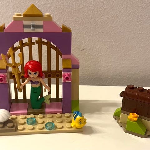 LEGO minifigur föreställande en drottning med krona, röd klänning med blå och guld detaljer samt vit mantel med svart mönster.