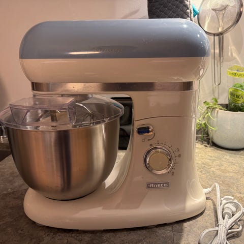 Retro köksmaskin i vit färg med rostfri bunke. Utrustad med visp och flera hastighetsinställningar. Passar för blandning och vispning av olika ingredienser i köket.