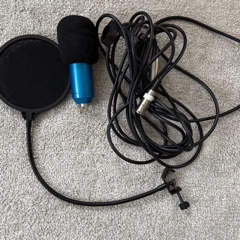 Kondensatormikrofon med tillbehör inklusive mikrofonstativ, kabel och skyddsskydd. Produkten är svart med guldfärgad mikrofonhuvud. Mikrofonen är avsedd för ljudinspelning.