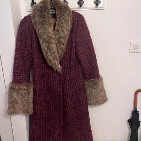 En unik hellångt ullkappa i mörkbrun med svart sammet runt handlederna
