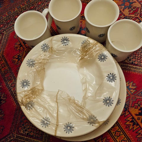 Guzzini Picnic Ball. 27 cm diameter, 23 cm hög. Innehåller 6 glas, 6 tallrikar, 6 assietter, 6 djupa tallrikar samt 2 burkar för kryddor mm.