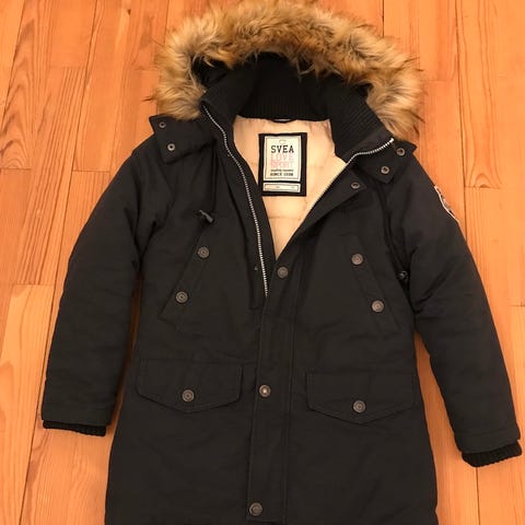Svea barnjacka för flicka i storlek 152. Jackan är svart. Den har en huva och dragkedja framtill.