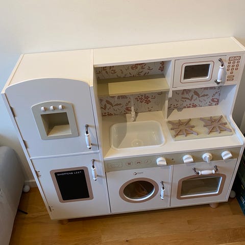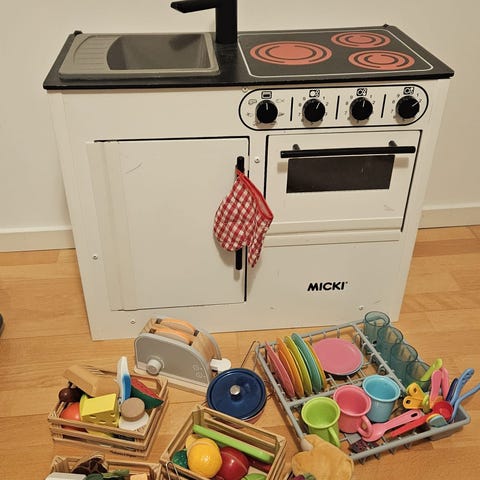 Äldre modell av kök för barn, troligen från 50/60-talet, med blandade kökstillbehör från bl.a. loppis, IKEA och Biltema. Majoriteten av tillbehören är i tyg, trä eller metall. På spisen finns märkt "NK" på ugnsluckan.