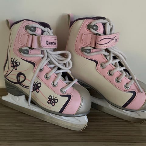 Skridskorna är vita med rosa detaljer och har justerbara remmar för bra passform. Passar för olika typer av skridskoåkning och är anpassade för barnets fotstorlek.