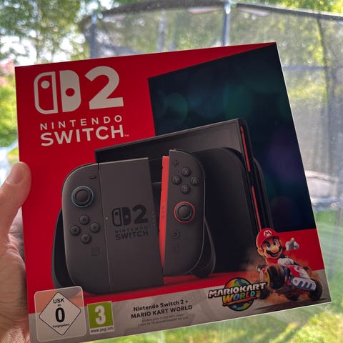 Nintendo Switch 2 konsolen med en Nintendo Switch 2 Pro Kontroll, ett fodral och ett grepp man kan koppla på konsolen för skönare handhållning. Inga spel ingår, allt säljs som ett paket. Alla original delar till Nintendo Switch 2 konsolen ingår.