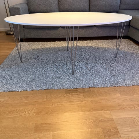 Soffbord i vit färg med en oval form och metallben. Bordet har en enkel och funktionell design som passar i vardagsrum eller liknande utrymmen.