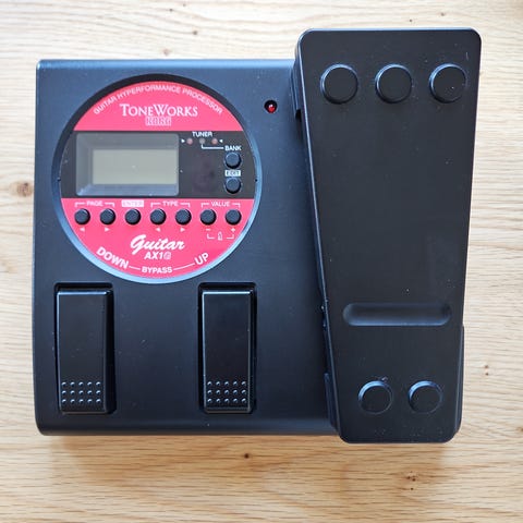 Korg AX10G är en multi-effektpedal för gitarr med olika inställningar för distorsion, överstyrning och delay. Pedalen har flera rattar för att justera ljudnivå, ton och effektstyrka samt fotpedaler för att aktivera effekter. Den är utformad för att användas med elektrisk gitarr.