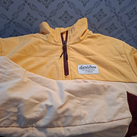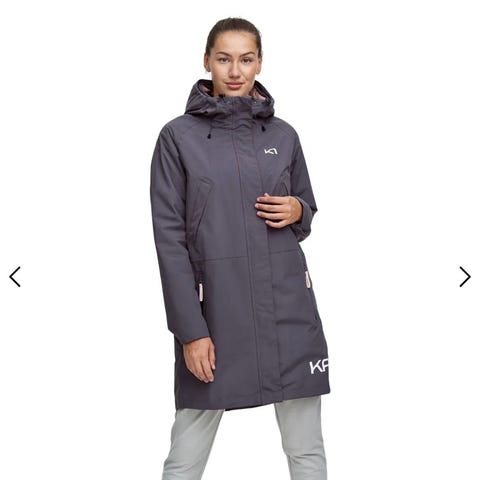 Kari Traa Övriga ytterkläder för dam i storlek S. Jackan är grå och tillverkad i dunmaterial. Den har huva med avtagbar pälsdetalj och flera fickor. Passar för utomhusbruk. Jackan är lång och går längre ner där bak, finns även dragkedja baktill