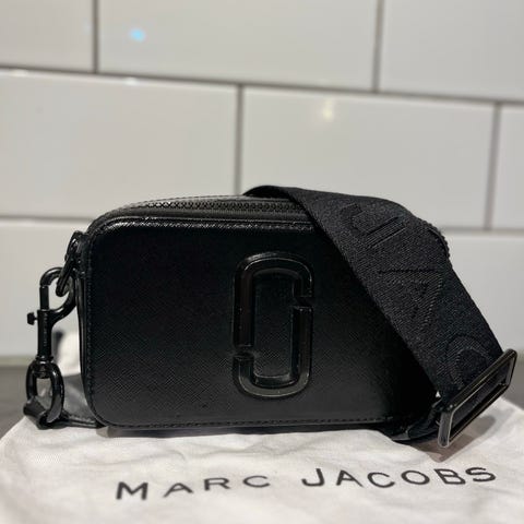 Marc Jacobs läderväska för kvinna i svart färg. Väskan har flera dragkedjeförsedda fack och en justerbar axelrem. Insidan är fodrad med ett mönstrat tyg med Marc Jacobs-logotyp.