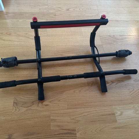 Selling a Corength / Decathlon 70 cm pull-up bar that clamps into the door frame and can be removed quickly when not in use. The bar is adjustable from about 65 to 95 cm, so it fits most standard doors; it weighs around 2 kg and the grip diameter is about 32 mm, which is comfortable for the hands. It has a blue locking ring system that helps keep the bar in place when tightened, and rubber ends on both sides to protect the frame. Great for simple home workouts for back, arms and abs using only bodyweight. Wall mounts/screws are not included in this listing. Pick up only in the Gothenburg area, no shipping.
