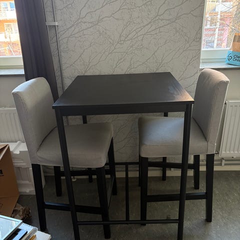 Stolarna är från IKEA och inget slitage på dem, bordet är från Mio och bordsskivan är väldigt repig och har flera märken. Bordsdduk i beige och bordstabletter på bilden medföljer.