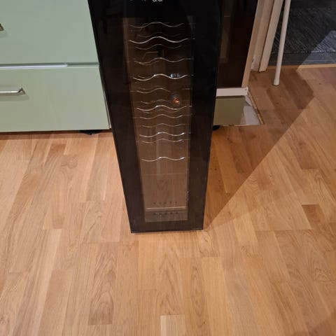 Candy vinkyl för förvaring av vinflaskor. Skåpet har glasdörr och metallhyllor för flaskor.