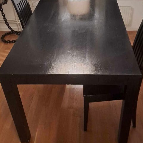 6 stycken stolar till matbord. Ommålade till svart, färgen bortskavd på vissa ställen. Stabila stolar i ek.