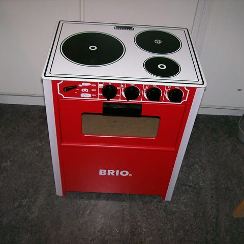 BRIO Spis för barn i trä med svart och vitt utförande samt röda vred. Leksak för barn att leka med i köksmiljö.