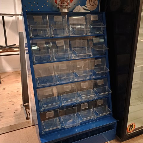 Vykortställ, stående golvmodell med hjul. Höjd 180cm, fack för vykort med bredd 15cm och 21cm ( A5 stående och liggande format).