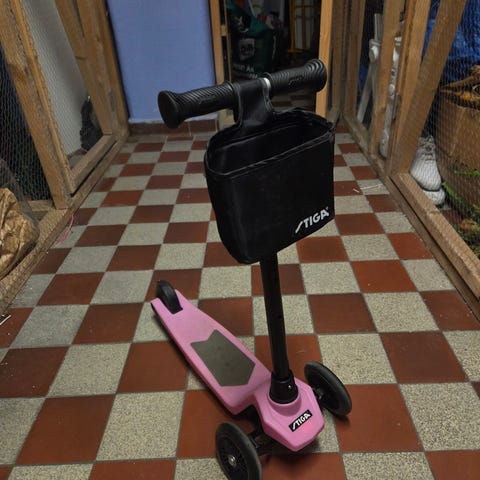 Stiga sparkcykel i rosa färg utrustad med tre hjul för stabilitet. Försedd med en svart förvaringsväska fäst vid styret. Passar barn för lek och transport.