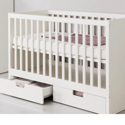 Spjälsäng vit från Ikea i mycket bra skick, några få skav på kanter. Madrass ingår