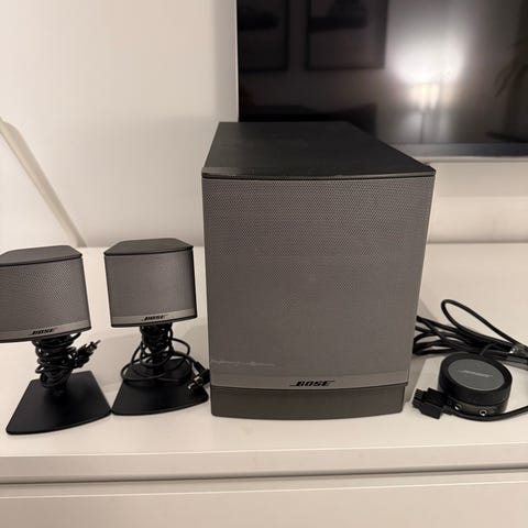 Bose Companion 5 högtalarsystem med två satellithögtalare och en subwoofer. Systemet har en kontrollenhet för volym och anslutningar för dator och andra ljudkällor. Färgen är svart och grå.