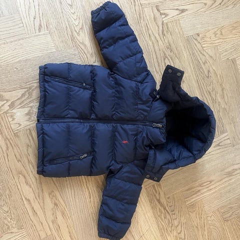 Moncler vinter barnjacka i blå färg, storlek 98, Tillverkad i polyester. Jackan har en vadderad design med huva och flera fickor, varm och i mycket bra skick.
