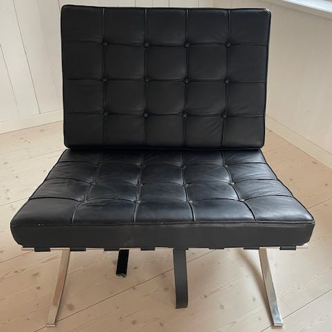 Barcelona-stol med svart läderklädsel och kromram. Stolen har klädd sits och ryggstöd med knappdetaljer och en bärande ram med remmar under sitsen. Lädret har en liten reva i kanten av sitsen, se sista bilder