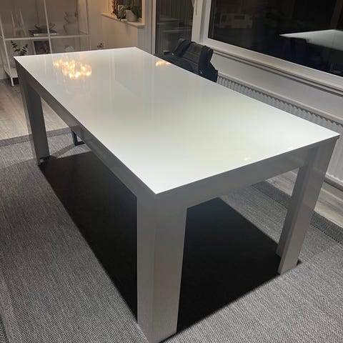 Matbord (Mio Emma) i lackerat faner med ben i massiv ek. Kan förlängas till 160cm med uppfällbar skiva.