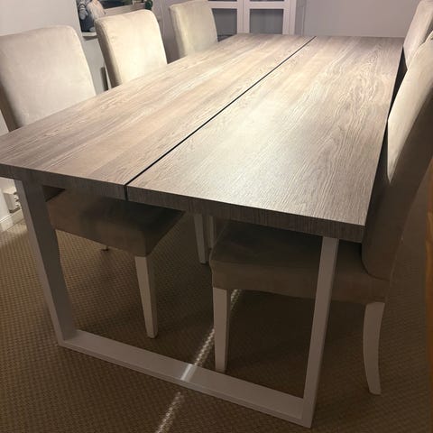 Stilrent matbord med matchande stolar och bänk. Bekväma, klädda sittplatser i grått och stabilt bord i modern design. Sparsamt använd och i mycket fint skick. Perfekt för hemmet – redo att användas direkt.