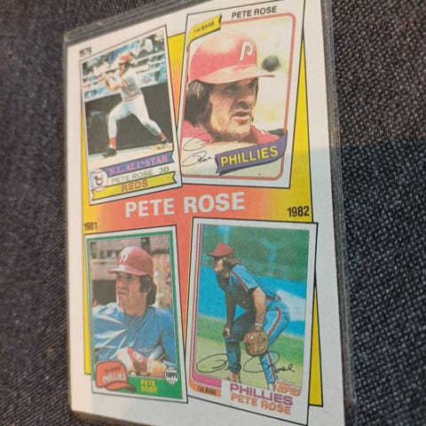 Pete Rose Baseballkort Set med kort från åren 1963 till 1965. Setet innehåller flera olika kort med bilder och statistik från Pete Roses karriär under denna period. Kortens baksidor visar detaljerad information om spelåren och prestationer.