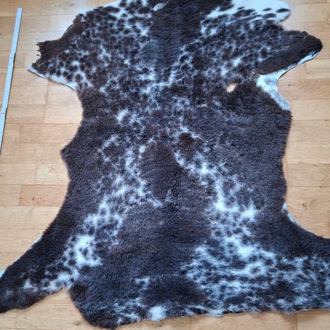 Mattan är tillverkad av fårskinn och har en naturlig form. Den kan användas som golvmatta eller dekorativt inslag i hemmet.