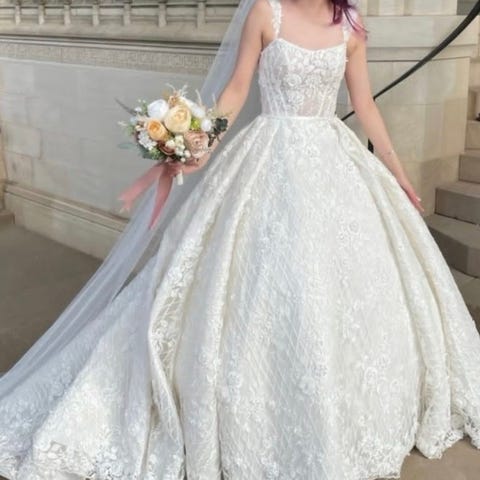 Handgjord guldig brudklänning med vackra pärlor samt slöja.