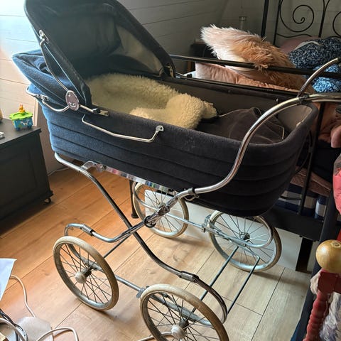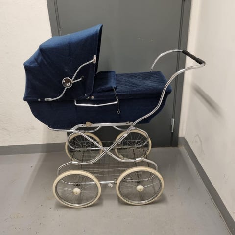 Silver Cross barnvagn i marinblått med kromade detaljer och hjul. Vagnen har en liggdel med stoppad insida och ett svart handtag med vit dekor. Går att fälla upp så att barnet kan sitta. En nätkorg finns under vagnen för förvaring.