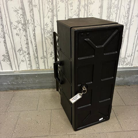 Elektroniskt säkerhetsskåp i svart färg med digitalt kodlås. Nypris 499kr