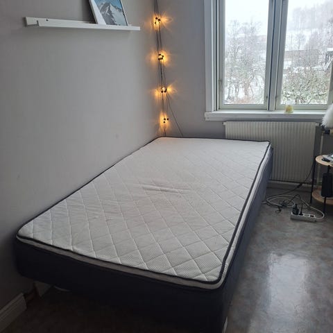 Resårmadrass i svart tyg med ben, 120 cm bred. Använd som gästsäng därav sparsamt använd. Vid intresse följer bäddmadrass med och kommer då att tvättas först. Katt finns i hemmet.