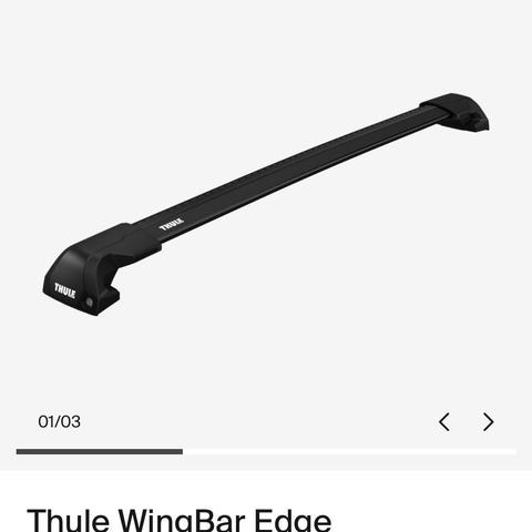Thule wingbar edge, mycket sparsamt använda. Har suttit på en Audi Q3 2017 (modell 2012-2018). Går säkert att montera på andra bilar med anpassningskit från Thule. Längd 95cm och 86cm.