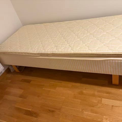 Medelfast 90x200 cm i bra skick. Ben brynilen 20 cm ingår. Hämtas i Midsommarkransen