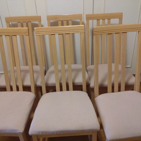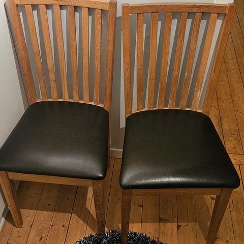 Matstolar i massiv ek. Ljus klädsel som är lätt att torka av. Mycket stabila. Säljes för 200 kr styck.