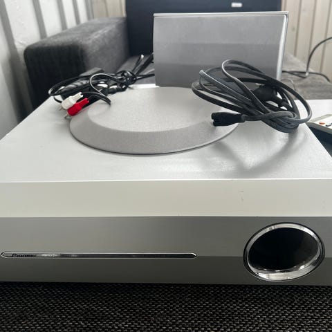 Pioneer hemmabiosystem inklusive bluetooth, 5 högtalare och en subwoofer. Anslutningar för olika ljud- och bildkällor finns på baksidan av huvudapparaten