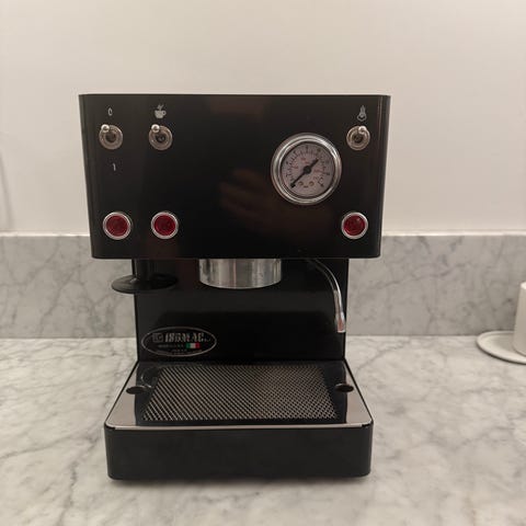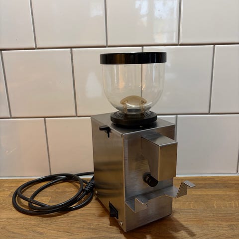 Espressomaskin i rostfritt stål med inbyggd tryckmätare och ångrör för att skumma mjölk. Kaffekvarn i rostfritt stål med bönbehållare. Maskinen fungerar bra och har rengjorts kontinuerligt.