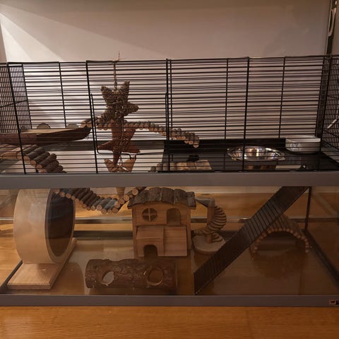 Glasbur med metallgaller och trämaterial (2st stege och två plattform). Burens botten är av glas med en överdel av metallgaller. Inredning i trä med ramper och plattformar. Buren är avsedd för smådjur eller gnagare och erbjuder flera nivåer för rörelse och aktivitet. Nivåerna går att flytta och även ta bort.