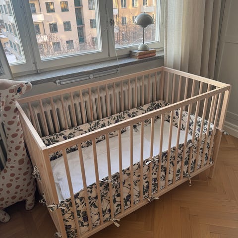 IKEA Myrra spjälsäng med måtten 60x120 cm. Sängen har en låda för förvaring och är tillverkad i trä med vit och naturfärgad finish.