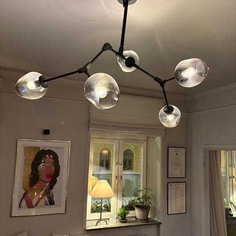 Fast ansluten. Professionell installation rekommenderas. Observera att denna pendellampa inte kan hängas i ett välvt tak.
