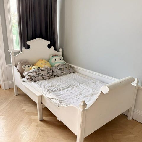 Antik växasäng vitmålad, yttermått 83 cm bred, 73 innermått. Madrass finns. Utdragbar från 80 till 140cm. Botten är i två delar. Sänggaveln är 133 hög på huvudsidan.