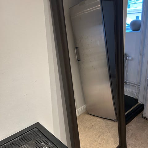 IKEA HOVET spegel med svart ram. Spegeln är rektangulär och har en modern design som kan användas i olika rum för att förstora och ljusa upp utrymmen. Den perfekta stora spegeln!