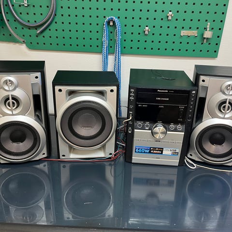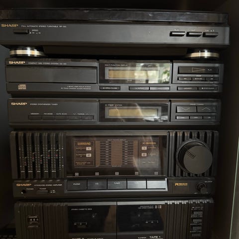Sharp stereopaket med flera komponenter för ljuduppspelning och förstärkning. Inkluderar enheter för olika ljudfunktioner och en subwoofer. Svart färg och kompakt design för hemmabruk.