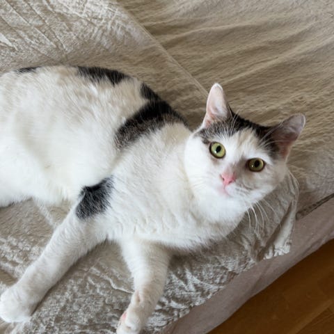 Jag söker ett nytt, tryggt och kärleksfullt hem till min vita honkatt med blå ögon (se bild).